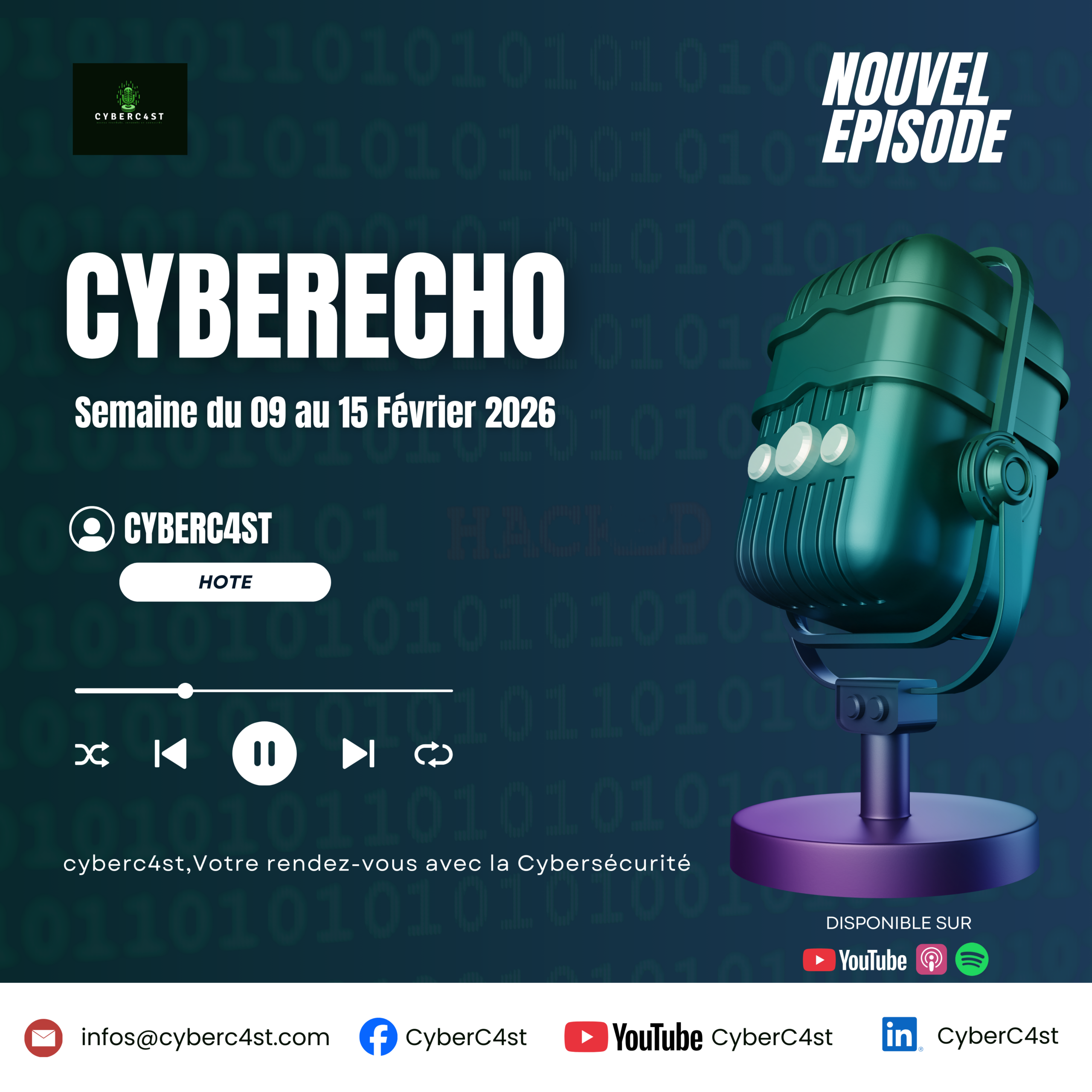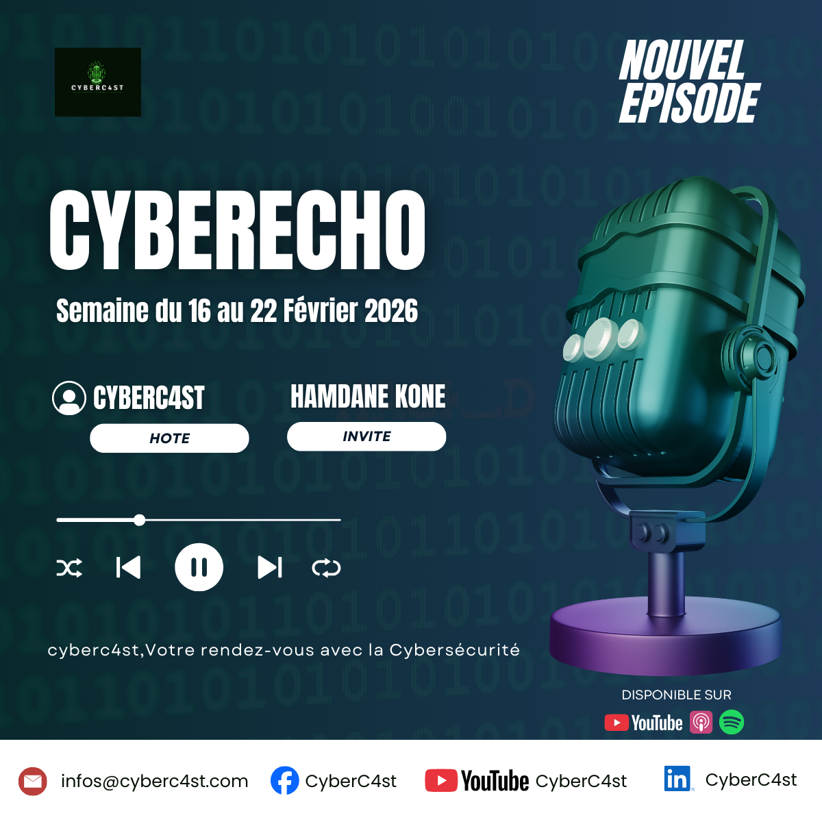 Cet épisode aborde les menaces cybernétiques récentes, notamment un malware Android, des attaques de phishing, une cyberattaque contre une administration sénégalaise, des initiatives de sécurité en Côte d’Ivoire, et une vulnérabilité critique chez Cisco. Les discussions soulignent l’importance de la cybersécurité dans un monde de plus en plus connecté.